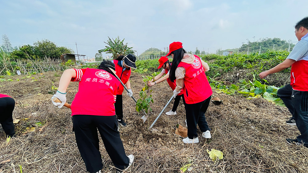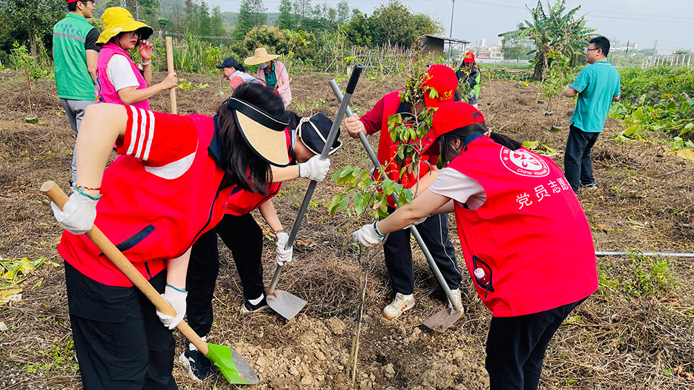 活動現場,職工們熱情高漲、配合默契,有序完成揮鋤挖坑、扶苗培土、踩實澆水等工序。經過共同努力,120株龍眼樹苗扎根沃土,為大地增添盎然生機。
